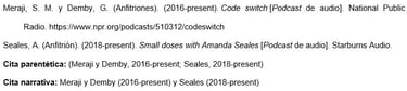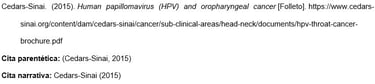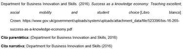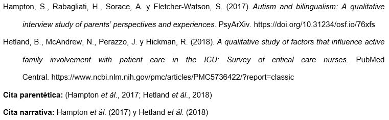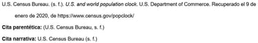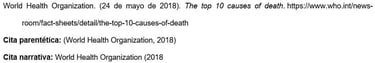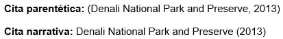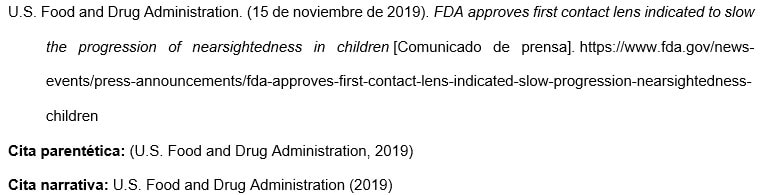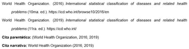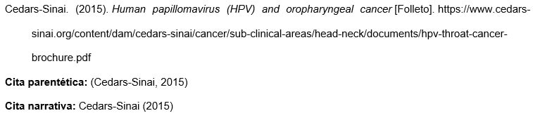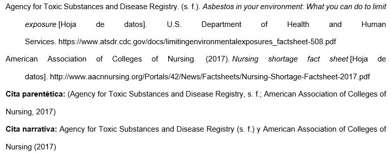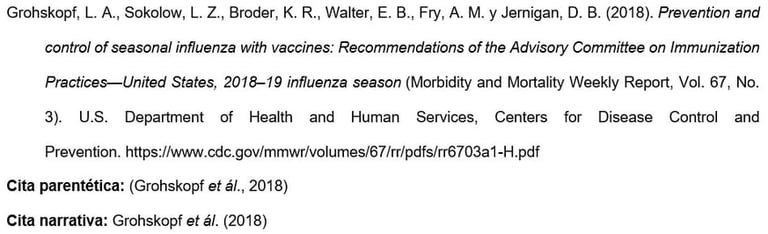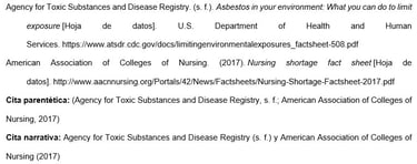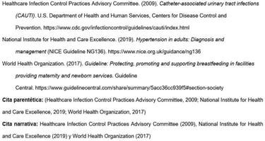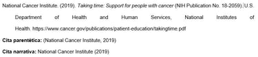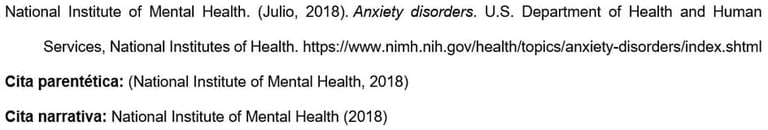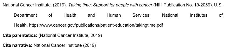 Los nombres de las agencias matrices que no están presentes en el elemento de autor aparecen en el elemento de fuente (en el ejemplo, U.S. Department of Health and Human Services, National Institutes of Health). Esto crea citas concisas en el texto y listas de referencias completas.