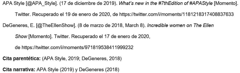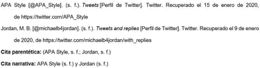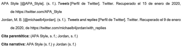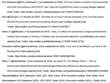 Presentar el nombre del autor individual o grupal de la misma manera que se haría para cualquier otra referencia. Luego, proporcionar el identificador de Twitter (comenzando con el signo @) entre corchetes, seguido de un punto.