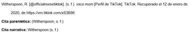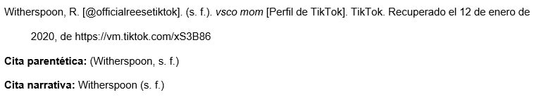 A diferencia de otras páginas de perfil de redes sociales, la página de TikTok no tiene una "Inicio" u otras pestañas. Para el título de la referencia, usar las primeras 20 palabras de la descripción (en el ejemplo, "vsco mom").