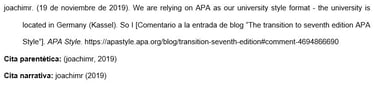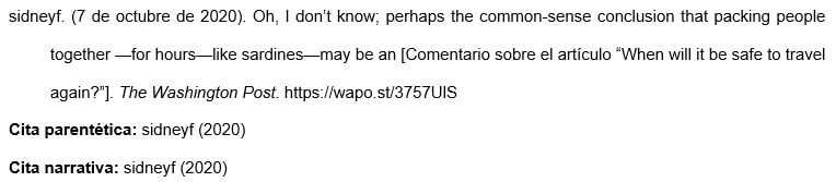 Insertar hasta las primeras 20 palabras del comentario; luego, escribir "Comentario en la publicación del foro en línea" y el título completo de la publicación en la que apareció el comentario (en cursiva y entre corchetes).