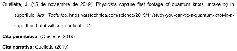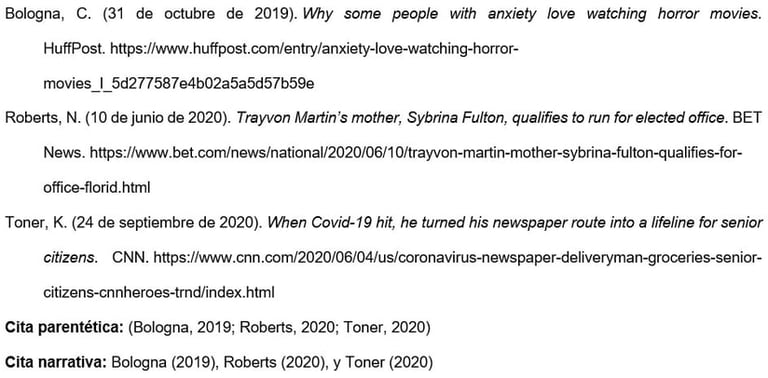 Utilizar este formato para artículos de sitios web de noticias. Algunos ejemplos comunes son BBC News, BET News, Bloomberg, CNN, HuffPost, MSNBC, Reuters, Salon y Vox. Estos sitios no tienen periódicos diarios o semanales asociados.