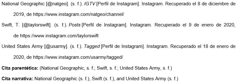 Usar el nombre de la página de perfil que se desea citar en el elemento del título de la referencia (por ejemplo, "Publicaciones", "IGTV", "Etiquetado").